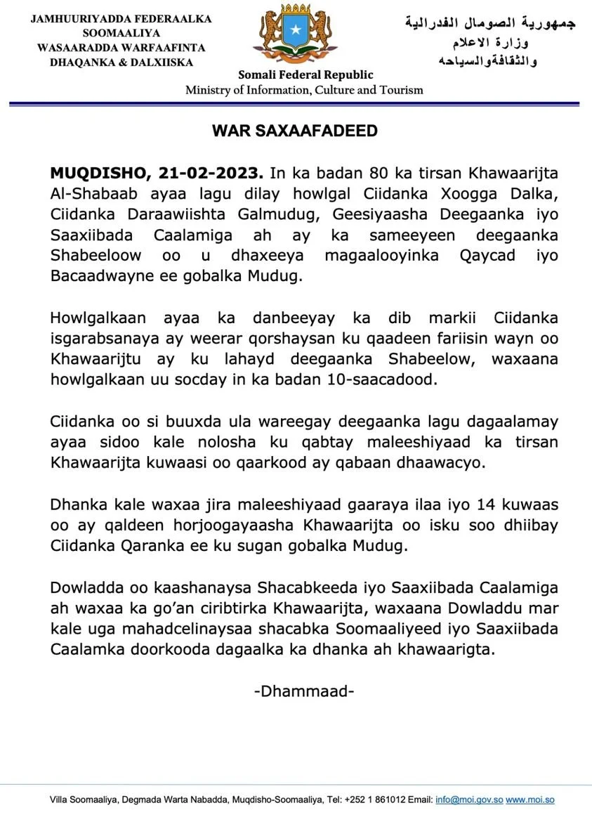 (MUDUG)-Wararka ka imaanaayo Maamulka Galmudug ee bartamaha dalka Soomaaliya ayaa sheegaayo in ciidamadda xooga dalka Soomaaliyeed oo kaashanayo xoogaga degaanka iyo saaxibada caalamka ayaa si wadajir ah u qadeen weerar qorsheysan oo ku wajahan goob ey fadhiyeen kooxda Khawaarijta. Degaanka Shabeelow oo ah degaan u dhexeeyo Qaycad iyo Bacaadweyn ee Gobolka Mudug ayaa ah halka ey Khawaarijta fadhiga ka dhigatay waxaane kooxda halkaas looga dilay dagaalyahano gaaraayo ilaa 80-dagaalyahan waxaane halkaas looga qabsaday Hub iyo saanad fara badan oo ey goobta kaga carareen,maalmo ka hor ayey ahayd markii kooxda Khawaarijta ey iska soo dhiibeen 14-dagaalyahan kuwwaso hadda ku jiro gacanta DFS. Dagaalka lagula jiro kooxda Khawaarijta ee ka socdo maamulka Galmudug ayaa maraayo heer gabgaba ah waxaane loo soo gudbi doonaa dhulka ey kooxdu kaga sugan tahay maamulka Galmudug.