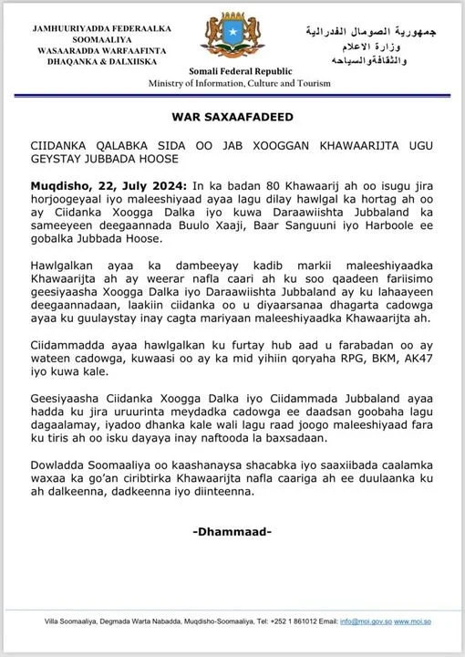 (MUQDISHO)-Wararka ka imaanayo magaaladda kismaayo ee caasimadda u ah Gobolka Jubadda Hoose ayaa sheegaayo in ka badan 80-dagaalmae oo ka tirsan Alshabaab isuguna jira Horjoogayaal iyo Maleeshiyaad in lagu dilay hawlgal ka hortaga ah oo ey Ciidanka Xooga Dalka Soomaaliyeed iyo kuwa Daraawiishta Jubaland ka sameeyeen degaanadda Buulo-Xaaji,Baar Sanguuni iyo Harboole oo dhaammaantood ka wada tirsan G/Jubadda Hoose. Hawlgalkaan ayaa ka dambeeyey ka dib markii Maleeshiyaadka Alshabaab ey weerar nafla caarinimo ah ey ku soo qaadeen fariisimo geesiyaasha Xooga Dalka Soomaaliyeed iyo kuwa Daraawiishta Jubaland ey ku lahaayeen degaanadda aan soo sheegnay,laakin ciidamadda oo u diyaarsanaay dhagarta cadawga Alshabaab ayaa ku guuleystay iney cagta mariyaan maleeshiyaadkii Alshabaab ee soo duulay. Ciidamadda ayaa hawgalkaan ku furtay hub aad u fara badan oo ey wateen cadawga soo duulay,waxaane hubkaasi ka mid ah Qoryaha”RPG,BKM,AK47” iyo kuwa kale oo fara badan. Geesiyaasha Ciidanka Xooga Dalka Soomaaliyee iyo kuwa Jubaland ayaa hadda ku jira Ururinta Meydadka cadawga Alshabaab ee daadsan goobihii lagu dgaaalamay saakay,iyadoo dhanka kale weli lagu raad joogo maleeshiyaad fara ku tiris ah oo isku dayaya iney naftooda la baxsadaan. Dawladda Federaalka Soomaaliya oo kaashaneyso shacabkeed iyo Saaxibadda Caalamka ayey ka go’an tahay iney ciribtirto kooxda Alshabaab ee nafla caariga ah isla markaasne duulaanka ku ah dalkeyna,dadkeyna iyo diinteyna.