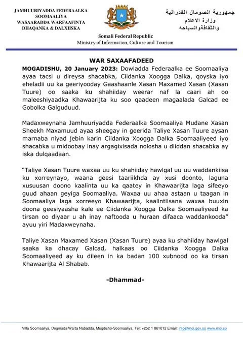 (GALCAD)-Kooxda Khawaarijta ee Alshabaab ayaa saakay waaberigii waxa ey weerar ku bilawday Qaraxyo ku soo qaadeen saldhig ey deganayeeny CXDS kuna yiilay degaanka Galcad kana tirsan Gobolka G/Gaduud ee maamulka G/Mudug,weerarkaan ey soo qaadeen Khawaarijta ayey si aad ah ugu jabeen waxaane looga dilay maleeshiyaad gaaraayo ilaa 200-Maleeshiyo waxa eyna goobta uga carareen dhaawacoodii. War Saxaafadeed ka soo baxay Wasaaradda Warfaafinta JFS ayaa lagu sheegay in Khawaarijta weerarkii saakay lagu gaarsiiyey Jab aad u xoogan.