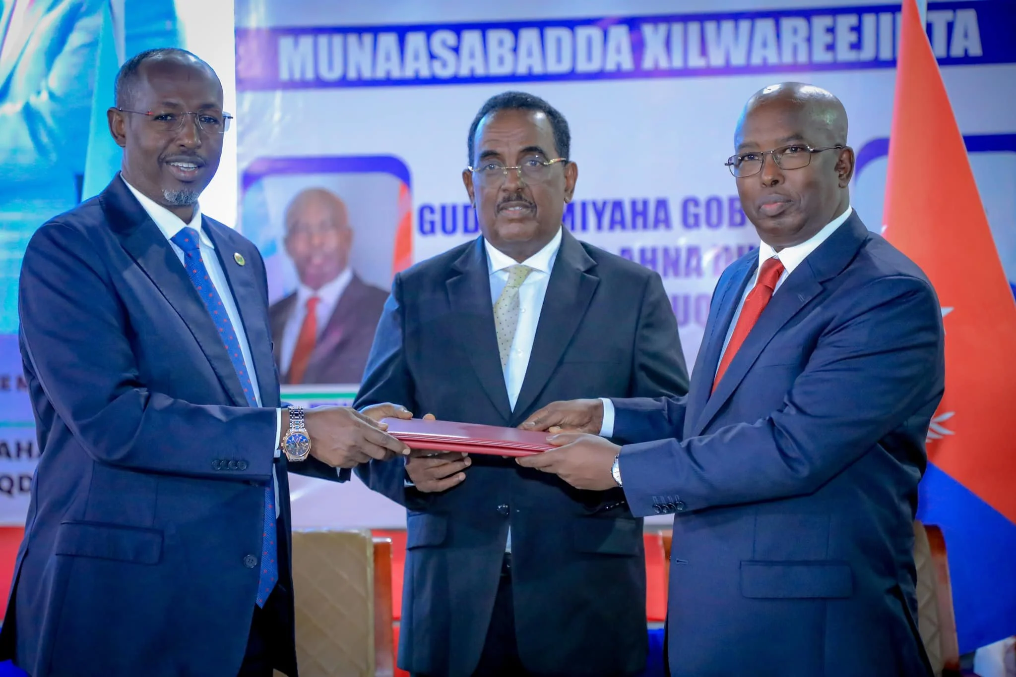 (MUQDISHO)-Reysal Wasaaraha Xukuumada Jamhuuriyadda Federaalka Soomaaliyeed Md.Xamse Cabdi Barre ayaa ka qeybgalay munaasabad ey xilka kula wareegaayeen Gudoomiyaha cusub ee Gobolka Banaadir ahne Duqa caasimadda Muqdisho Md.Maxamed Axmed Amiir iyo Gudoomiyihii hore ee G/banaadir ahaayne Duqa Caasimadda Muqdisho Md.Yuusuf Xuseen Madaale. RW-Xamse ayaa ku amaanay Gudoomiye Madaale shaqooyinkii adkaa ee uu ka soo qabtay G/Banaadir mudadii uu joogay isagoona kula dardaarmay duqa cusub ee G/banaadir Amiir inuu dardar geliyo Qorshaha Horumarinta caasimadda oo ey ugu horeyso adeegyadda dadweynaha iyo in bulshada la gaarsiiyo Doorasho Qof iyo Cod ah si ey u soo doortaan Masuuliyiintooda. Wasiirka Arrimaha Gudaha ee XFS Md. Xildhibaan Cali Xoosh ayaa xilka u kala wareejiyey labada masuul iyadoo munaasabada ey goobjoog ka haayeen Wasiiro iyo Xildhibaano ka wada tirsan XFS,waxaa kaloo goobjoog ahaay Gudoomiyeyaashii hore ee G/banaadir,Gudoomiye ku xogeenadda G/banaadir,Odayaal dhaqameed, Siyaasiyiin,Ganacsato,Haween,dhallinyaro iyo marti sharaf kale oo ka tirsan qeybaha kale gedisan ee bulshada.