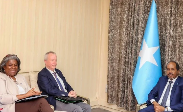 (WASHINGTON)-Dalka Maraykanka waxaa ku sugan Madaxweyne Xasan Sheekh Maxamuud iyo wafdi uu hogaaminaayo,wafdigaan ayaa bilaabay inuu kulano gooni gooni ah la yeesho qaar ka mida masuuliyiinta dalka Maraykanka. Safiiradda Maraykanka u fadhida Qaramada Midoobe Linda Thomas-Greenfield ayaa magaaladda Washington DC waxa ey kula kulantay Madaxweynaha Jamhuuriyadda Federaalka Soomaaliya Md.Xasan Sheekh Maxamuud,Danjire Linda Thomas-Greebfield ayaa ku bogaadisay sida ey uga go’an tahay Madaxweyne Xasan Sheekh dib u heshiisan qaranka iyo horumarada laga sameeyey hawlgalada ka dhanka ah kooxda argagixisada Alshabaab. War saxaafadeed ka soo baxay xafiiska danjire Linda Green-field ayaa lagu sheegay in Danjire Linda u cadeeysay Madaxweyne Xasan Sheekh in dalka Maraykanka ey ka go’an tahay inuu garab istaago yoolasha xilliga kala guurka amniga ee dawladda Federaalka Soomaaliya marka la gaaro dabayaqada bisha Disembar-2024-ka. Danjire Linda Green-field ayaa sidoo kale waxa ey hoosta ka xariiqday sida ey uga go’an tahay dalka Maraykanka inuu wax ka qabto cunto yarida ka jirta Soomaaliya ayadoo dul istaagtay ballanqaadyadii Maraykanka horay u sameeyey ee dhammaa $524-milyan oo doolaar,lacagtaan ayaa ahayd mid lagu taageerayo bani’adanimada oo dheeraad ah,Maraykanka ayaa lacagtaan waxa uu ugu talagalay Gobolka Geeska Afrika si wax looga qabto dhibatooyinka soo noqnoqday ee abaaraha.