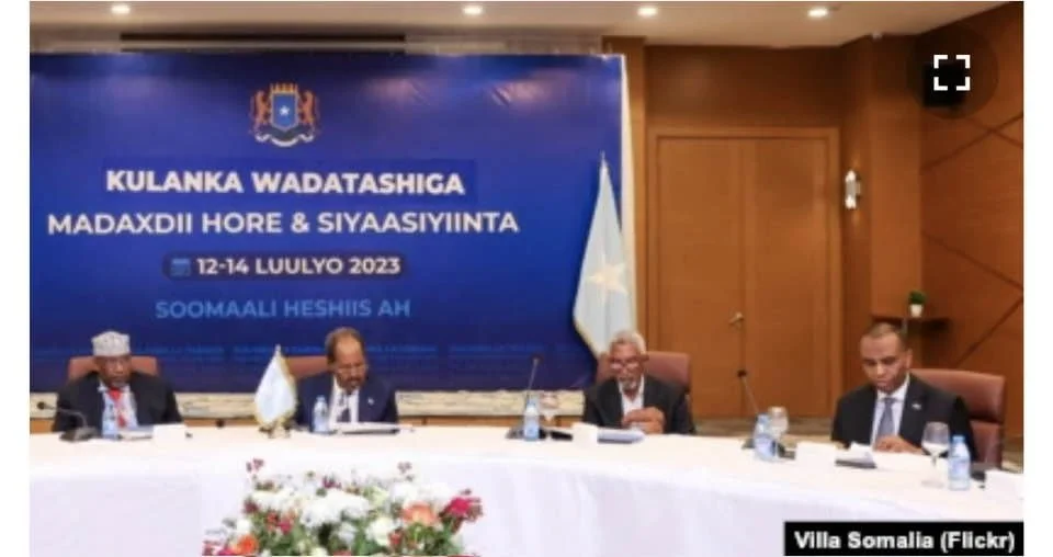 (MUQDISHO)-Magaaladda Muqdisho waxaa maanta lagu soo gabagabeeyey shirkii u dhexeeyey Mucaaradka iyo Dawaladda Federaalka Soomaaliya ee uu hogaaminaayo MW-Xasan Sheekh Maxamuud,Gudoomiyeyaasha labada aqal ee baarlamaanka(Sheekh Adan Madoobe iyo Cabdi Xaashi) iyo RW-Xamsa Cabdi Barre,shirkaan ayaa waxaa dhinaca Mucaaradka ku metelaayey Lix Reysal Wasaare hore,Hal Madaxweyne,Seddex Gudoomiye Baarlamaan,Seddex Musharaxa Madaxweyne hore iyo Masuuliyiin horey uga tirsanaay Midawgii Musharaxiinta waqtigii uu dalka Farmaajo maamulaayey. Kulanka Wadatashiga Madaxda DFS iyo Siyaasiyiintii hore ayaa socday inta u dhexeysay 12/7/23 ilaa 13/7/23-ka,Qodobada looga hadlay shirka ayaa u badnay arrimo Masiiri u ah dalka Soomaaliya gaar ahaan heshiiskii ey soo gaareen Golaha Wadatashiga Qaranka 27/5/23-ka.Qodobada talooyinka laga dhiibtay waxaa ka mid ahaay Heshiiska Hanaanka Doorashooyinka dalka ee kala ah: (1)-Nuuca Doorashada Dalka. (2)-Nidaamka Madaxtinimada Dalka. (3)-Nidaamka Xisbiyada Badan. (4)-Gudiga Doorashada Qaranka. (5)-Mideynta Mudda Xileedka Hayadaha Federaalka iyo Kuwa Dawalad Goboleedyada. (6)-Habraac Dib u Eegista Dastuurka.