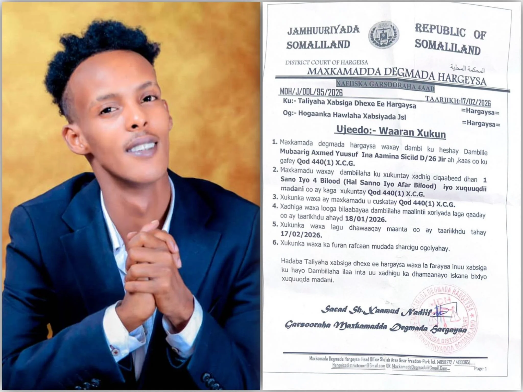 (HARGEISA/SL)-Maxkamadda Degmada Hargeysa ayaa xukun ku ridday Mubaarik Axmed Yuusuf, oo loo yaqaan Mubaarik Oktoober, kadib markii lagu helay dambi la xidhiidha jidh dil uu u geystay xaaskiisa, fannaannada Farxiya Axmed Caddaawe Geedi (Farxiya Fiska). Sida ku cad warqadda rasmiga ah ee kasoo baxday maxkamadda, taariikhdeeduna tahay 17/02/2026, dambiga lagu helay fannaanka waxa uu ku salaysan yahay qodobka 440(1) ee Xeerka Ciqaabta. Maxkamaddu waxay ku xukuntay Mubaarik Oktoober xadhig dhan hal sano iyo afar bilood, iyadoo sidoo kale ku xukuntay inuu bixiyo xuquuq madani ah oo la xidhiidha falka lagu helay. Warqadda maxkamadda ayaa sheegaysa in muddada xadhigga laga bilaabayo maalintii la qabtay, oo ku beegnayd 18/01/2026, halka xukunkana si rasmi ah loogu dhawaaqay 17/02/2026. Sidoo kale, waxaa lagu caddeeyay in xukunka uu ka furan yahay racfaan muddada sharcigu oggol yahay. Ugu dambayn, maxkamaddu waxay farriin u dirtay Taliyaha Xabsiga Dhexe ee Hargeysa, iyadoo ku amartay in xabsiga lagu hayo fannaanka ilaa inta uu ka dhammaanayo xadhigga lagu riday, isla markaana uu bixiyo xuquuqda madaniga ah ee lagu waajibiyey. Wareysi ay Farxiya Fiska siisay warbaahinta 5 Febraayo ayay Farxiya ku sheegtay in ninkeeda Mubaarik Axmed Yuusuf, oo goobaha fanka looga yaqaano “Mubaarik Oktoober”, uu weerar ku qaaday, kuna hayay qol muddo ku dhow afar saacadood, halkaas oo ay sheegtay in uu ku jidhdilay. “Waxa igu dhacay ma aha wax yar. Ma aanan filayn,” ayay tidhi Farxiya. “Jidhkayga meel caafimaad qabta ma jirto. Wuu i ceejiyay, wuxuuna rabay inuu i dilo. Cunahayguna weli wuu i xanuunayaa.” Farxiya waxay sheegtay in Mubaarik la xidhay kadib dhacdada, balse lagu sii daayay dammaanad. Waxay intaas ku dartay in ay go’aansatay inay dacwad maxkamadeed la tiigsato, isla markaana ay haatan ku guddo jirto sidii ay dhibkeeda maxkamada ugu soo bandhigi lahayd.
