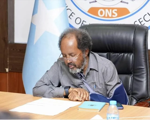 (MUQDISHO)-Madaxweynaha Jamhuuriyadda Federaalka Soomaaliya Md.Xasan Sheekh Maxamuud ayaa maanta waxa uu shir gudoomiyey shir looga hadlaayey arrimaha Amina dalka,shirkaan ayaa waxaa ka qeybgalay Wasiirka Gaashaandhiga DFS Md.C/qaadir Maxamed Nur iyo taliyeyaal ciidan eyna ka mid yihiin S/Guuto.Muxyadiin Sheekh Ibrahim oo ah Taliyaha Ciidamadda Xooga Dalka Soomaaliyeed,S/Guuto.Sulub Axmed Firin Taliyaha Ciidamadda Booliska Soomaaliyeed iyo masuuliyiin kale oo dhinaca Amniga kana tirsan hayadaha Amniga Qaranka. Dawladda Federaalka Soomaaliya ayaa hadda dagaal adag waxa ey kula jirtaa kooxda Alshabaab taaso dhumisay dhul fara badan ey kooxda horay u maamulaysay in ka badan toban sano oo xiriir ah,waxaane hadda gabagaba ah ciribtirka kooxda Alshabaab ee maamuladda Galmudug iyo Hirshabeele.