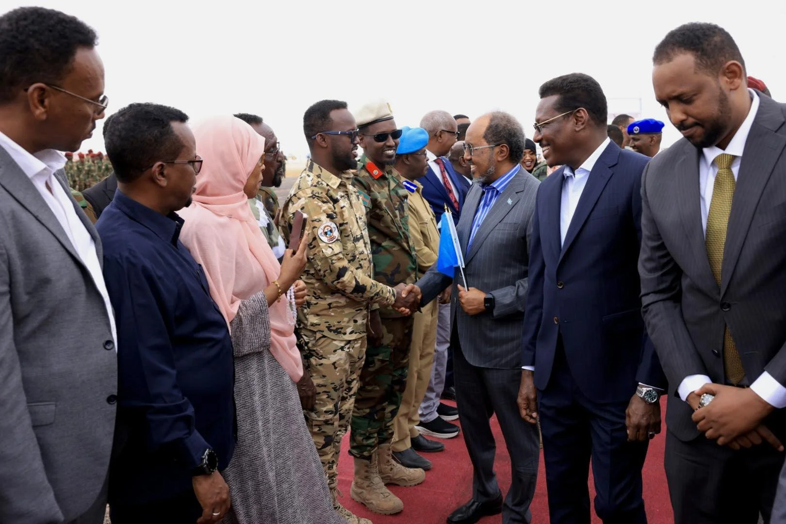 (DH/MAREEB)-Wararka laga helaayo caasimadda Dawlad Goboleedka Galmudug ayaa sheegaayo in Madaxweynaha Jamhuuriyadda Federaalka Soomaaliya Mudane Xasan Sheekh Maxamuud oo ey wehelinayaan Wasiirro ka tirsan Xukuumadda Federaalka ah iyo Saraakiisha Ciidamada Qalabka Sida ayaa soo gaaray magaalada Dhuusamareeb ee Xarunta Dowlad-goboleedka Galmudug. Madaxweyanaha ayaa waxaa sii diirran u soo dhaweeyey Madaxweynaha Dowlad-Goboleedka Galmudug Mudane Axmed Cabdi Kaariye(QOOR_QOOR), Kuxigeenkiisa Mudane Cali Daahir Ciid, Guddoonka iyo Xildhibaannada Golaha Wakiillada Galmudug, Bulshada iyo Odeyaasha dhaqanka ee reer Galmudug. Madaxweynaha Jamhuuriyadda Federaalka Soomaaliya Md.Xasan Sheekh Maxamud ayaa inta uu ku sugan yahay magaaladda Dh/mareeb waxa uu kulammo la leeylan doonaa Madaxda Dawlad Goboleedka Galmudug iyo qaybaha bulshada, isaga oo xarigga ka jari doona Mashaariic Horumarineed oo laga Hirgaliyey Galmudug. Sidoo kale, Safarka Madaxweynaha ayaa ku saleysan dardar gelinta dagaalka ka dhanka ah Khawaarijta, iyadoo uu xoogga saari doona abaabulka bulshada iyo dhiirri gelinta ciidamada naftooda u huraya xoreynta dalka.