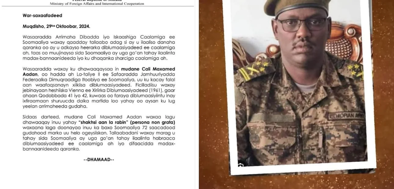 (MUQDISHO)-Wasaaradda Arrimaha Dibadda iyo Iskaashiga Caalamiga ah ee Jamhuuriyadda Federaalka Soomaaliya ayaa qaaday talaabo adag si ey u ilaaliso danaha Qaranka oo ey u adkeeyso heerarka diblomaasiyadeed ee Caalamiga ah,taaso muujineysa sida Soomaaliya ey uga go’an tahay ilaalinta Madax Banaanideed iyo ku dhaqanka Sharciyadda Caalamiga ah. Wasaaradda waxay ku dhawaaqeysaa in Md.Cali Maxamed Aden oo hadda ah La Taliyaha 2-aad ee Safaaradda Jamhuuriyadda Federaalka Dimuqaraadiga Itoobiya ee Soomaaliya uu ku kacay falal aan waafaqsaneyn xilkiisa Diblomaasiyadeed. Ficiladiisa waxay jebinayaan heshiiskii Vienna ee Xiriirka Diblomaasiyadeed ee sannadkii 1961-dii,gaar ahaan Qodobadiisa 41 iyo 42 kuwaaso faraya Diblomaasiyiinta iney Ixtiraamaan Shuruucda dalka martida loo yahay oo eysan ku lug yeelan Arrimaheeda Gudaha. Sidaas darteed,Md.Cali Maxamed Aden waxaa lagu dhawaaqay inuu yahay “Shaqsi aan la rabin”(Persona non Grata) waxaane laga doonayaa inuu ka baxo Soomaaliya 72-saacadood gudahood marka uu helo Ogaysiiskaan. Talaabadaan waxay marag u tahay sida Soomaaliya ey uga go’an tahay ilaalinta habraaca Diblomaasiyadeed ee Caalamiga ah iyo Difaacidda Madax-Banaanideeda Qaranka.