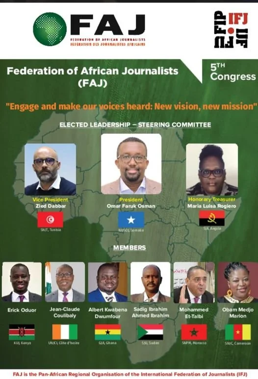 (DAKAR-SENIGAL)-Wararka ka imaanayo caasimadda dalka Senigal ee Dakar ayaa sheegayo in Saxafiyiinta Bariga Afrika ey ku Guuleysteen boosaska ey u ololeeya daryeelka Qaaradda ka dib markii doorasho la qabtay todobaadkan ey ku biireen Gudiga u ololeya daryeelka Saxaafadda. Ururka Saxafiyiinta Afrila FAJ oo kulmiya Ururada Saxafiyiinta Qaaradda Afrika ayaa hadda waxaa Madax u ah Md.Cumar Faaruuq Cismaan oo ah Xoghayaha Guud ee Ururka Saxafiyiinta Qaranka Soomaaliya ee NUSOJ. Kenya Erick Oduor oo ah Xoghayaha Guud ee Ururka Saxafiyiinta dalka Kenya(KUJ) ayaa ah Xubin u fadhiisan doono Gudga fulinta FAJ. Natiijooyinka doorashada ee lagu dhawaaqay Jimcihii waxay ka dhigan tahay in FAJ ey hadda yeelatay hogaan cusub oo ka kooban Madaxweyne,Madaxweyne ku xigeen,Hanti dhawre iyo lix xubnood oo ka tirsan Gudiga Fulinta ee FAJ. Doorashada ayaa la qabtay Arbacadii ina soo dhaaftay dhammaadkii shir weynihii shanaad ee FAJ oo la qabtay. Xilalka lagu kala Guuleystay ayaa sidaan kala ah:
