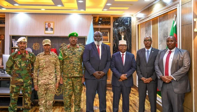 (MUQDISHO)-Wakiilka Gaarka ah ee Midowga Afrika ahna Madaxa AUSSOM, Danjire El Hadji Ibrahima Diene, ayaa maanta #Muqdisho ku booqday Wasiirka Gaashaandhigga ee Soomaaliya, Mudane Axmed Macallim Fiqi. Masuuliyiinta waxa ey ka wada hadleen fursadaha lagu xoojin karo isku duwista iyo iskaashiga u dhaxeeya AUSSOM & Ciidanka Amniga Soomaaliyeed si loo horumariyo Nabadda iyo Amniga Soomaaliya. Waxay kaloo ka wada xaajoodeen hawlgallada socdo ee ka dhanka ah AL-Shabaab iyo kooxaha kale ee sida sharci darrada ah u hubeysan. Danjire Diene ayaa soo dhaweeyey guusha uu gaaray Hawlgalka Duufaanta Aammusan, oo bartilmaameedkiisu yahay sidii kooxda AL-Shabaab lagaga adkaan lahaa Shabeellaha Hoose. Waxaa kulanka ka qeybgalay Ku Xigeenka Wakiilka Gaarka ah ee Midowga Afrika, Danjire Mouktar Ousman Karie, Taliyaha Ciidanka AUSSOM, S/Guud Sam Kavuma iyo Taliyaha Ciidanka Xoogga Dalka Soomaaliya, S/Gaas Odowaa Yuusuf Raage iyo mas’uuliyiin kale oo sar-sare.