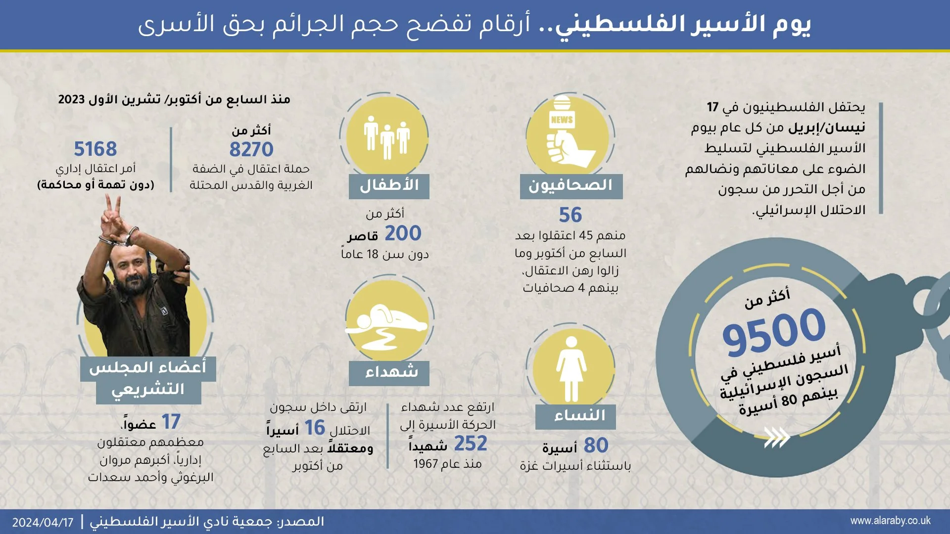 (QUDS)-Marka laga soo bilaabo sannadkii 1948-dii ilaa maanta la joogo dadka reer Falastiin waxa ey ku jireen dagaal aan lahayn dhammaad oo kala dhexeeyey Isra’iil,dagaalkan ayaa waxaa u sabab ah sida la sheegay Gumaysigii Ingiriiska ee waqtigaas oo dhulka reer Fakstiin ku wareejiyey Isra’iiliyiinta,hadaba dad reer Falastiin waxaa soo maray maalmo eysan marnaba hilmaami kareyn kuna qoran Xusuusto eyna isu soo gudbiyan min Jiil ilaa Jiil marka laga soo bilaabo1948-dii. Maanta waa maalin Arbaca ah waxa eyna ku beegan tahay 17/4/2024-ka,dadka reer Falastiin waxa ey u dabaal degaan Maalinta Maxaabiista Falastiin si ey muujiyaan dhibaatada iyo Halganka Maxaabiista si looga xureeyo Xabsiyadda Isra’iil. Halkan waxaa lagu soo bandhigay tirooyinka Maxaabiista ugu badan ee fadeexadda ku ah Isra’iil dembiyada ey ka gashay dadka reer Falastiin.